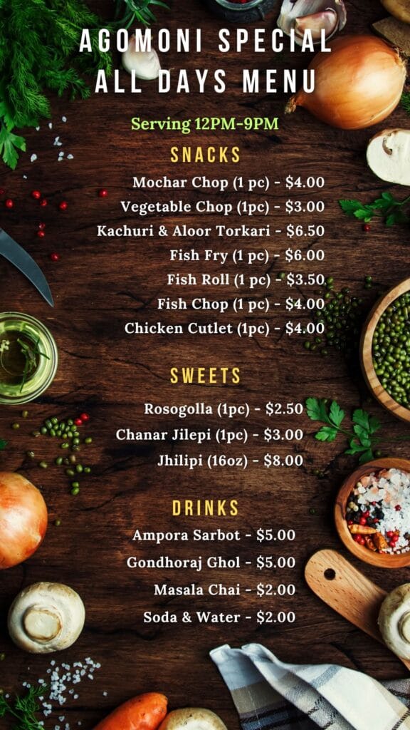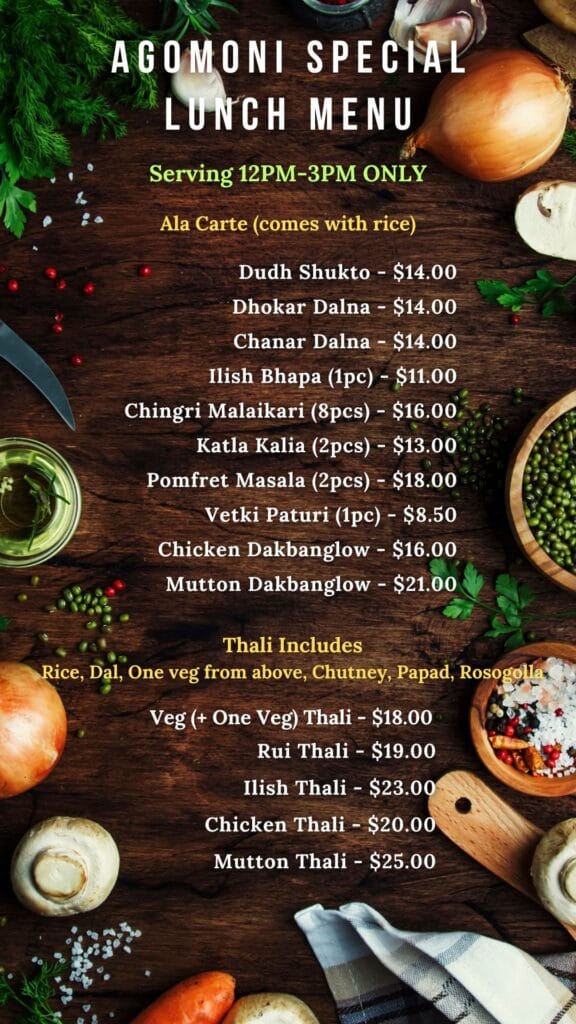 • We’re delighted to have Taste of Bengal (TasteofBengal) as the official food partner for Agomoni. All food items in the menu will be prepared and served by Taste of Bengal who is solely responsible to comply with all applicable laws and regulations governing the sale of food and/or beverages, including the Health and Safety Code policies and regulations.